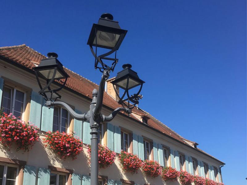 Vhm Eclairage - Ebersmunster - Mât tradition Alsace, bouquet Dor"a", Lanterne Airlie